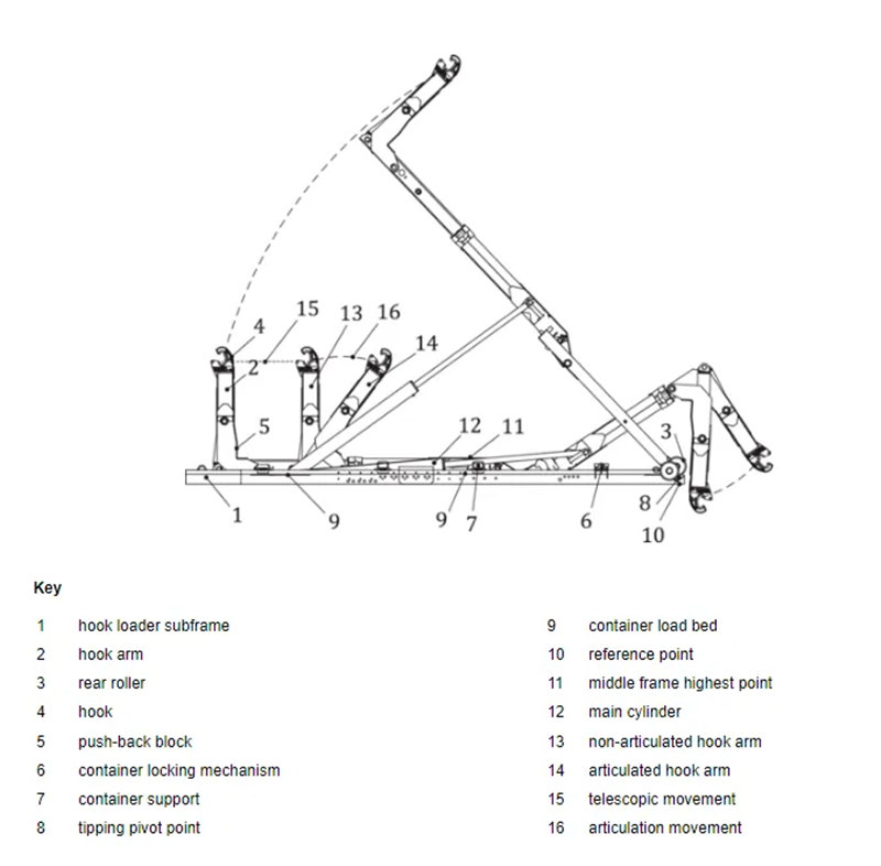 Kiini cha muundo mkuu wa lori la tani 10 linaloviringishwa lina mkono wa ndoano ya majimaji, fremu, na utaratibu wa kufunga. Mfumo wa majimaji huendesha mkono wa ndoano ili upanuke na kuinama, ukishika kwa usahihi kopo la takataka linalolingana. Kiungo cha kiufundi huvuta kopo vizuri kwenye fremu na kuliweka salama. Muundo mkuu umejengwa kwa chuma chenye nguvu nyingi, sugu kwa uchakavu na mgongano, na unaendana na ukubwa mbalimbali wa kopo la takataka.