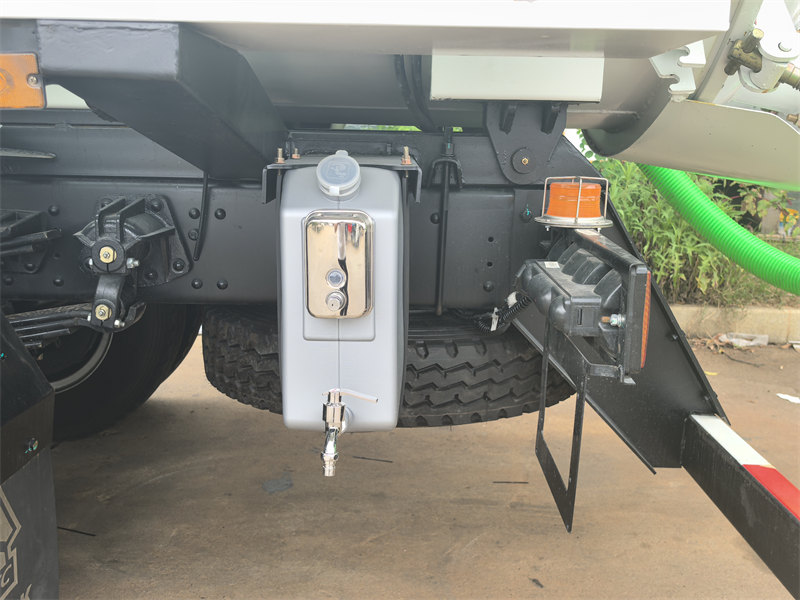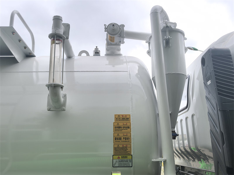 Mwili wa tangi umetengenezwa kwa chuma cha ubora wa juu Q345 chenye nguvu ya juu, unene wa mwili na kifuniko cha kichwa cha milimita 6, kikiwa na bamba za kuzuia ndani, mlango wa nyuma umefunguliwa na kufungwa kwa majimaji; mwili wa tangi unaweza kuinuliwa kwa silinda ya majimaji.