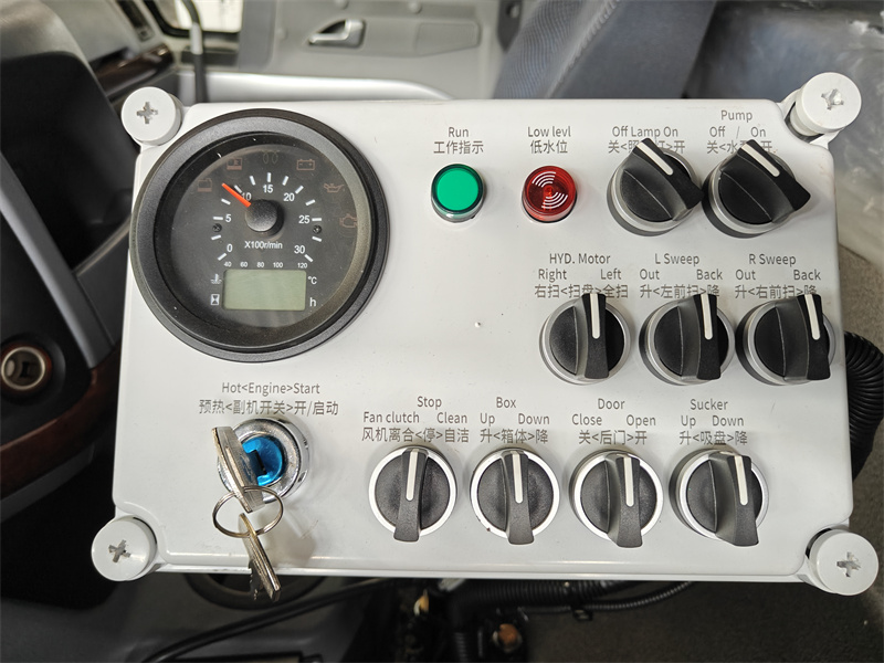 Mfumo wa udhibiti wa kielektroniki wenye akili huunganisha visanduku viwili vya uendeshaji kwenye teksi na karibu na vikombe vya kufyonza, kuwezesha udhibiti wa mguso mmoja wa kazi kama vile kuinua na kushusha brashi, kutupa tanki, na kuanza na kusimamisha blower, kuhakikisha uendeshaji rahisi na mzuri. Gari hili linatumia muundo jumuishi wa moduli unaounganisha mfumo wa umeme, mfumo wa kufagia, mfumo wa maji, na mfumo wa udhibiti wenye akili ili kufikia shughuli bora, za kuokoa nishati, na rafiki kwa mazingira.
