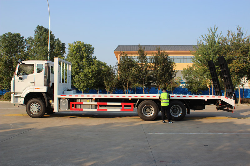 Lori la kujipakia lenyewe, linalojulikana pia kama lori la kubeba mizigo mizito isiyotenganishwa, lori la kujipakia lenyewe, lori la kusafirisha mizigo, ni lori maalum lililoundwa kwa ajili ya kubeba mitambo mizito ya ujenzi isiyotenganishwa, kama vile vichimbaji na vipakiaji. Sifa zake muhimu ni pamoja na deki tambarare linaloweza kupanuka kwa majimaji na vifaa vya kujipakia lenyewe kama vile miguu ya usaidizi wa majimaji, viwinchi, na rampu. Shukrani kwa chasisi yake yenye mzigo mwingi na muundo wa deki ulioimarishwa, huwezesha usafirishaji salama na ufanisi na upakiaji/upakuaji huru wa vifaa vikubwa katika maeneo ya ujenzi, migodi, na vituo vya usafirishaji, kupunguza utegemezi wa mashine za kuinua za nje. Kwa kuchukua mfano wa kichimbaji chenye mizigo mizito cha SINOTRUK HOWO cha tani 25, gari hili huongeza uwezo wa kitaalamu wa usafiri mzito kwa kutumia injini ya Weichai ya hp 380 na ekseli za kuendesha zenye mzigo mzito. Deki yake tambarare inaweza kupanuliwa kwa majimaji hadi mita 3 kwa upana, na inakuja ikiwa na vifaa vya kutolea mizigo vya majimaji vya mbele vya tani 25 na winchi ya tani 8, ikitoa uaminifu bora, utendaji wa kubeba mizigo, na ufanisi wa kujipakia lenyewe hata chini ya hali ngumu za kazi.
