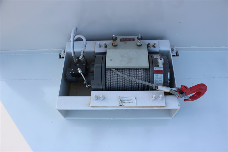 4. Kujipakia na Kupakua kwa Ufanisi Mwenyewe: Ina winchi ya majimaji ya tani 8, njia ya majimaji ya mita 2, na sehemu ya mbele ya usaidizi wa majimaji ya tani 25, inayoruhusu upakiaji na upakuaji wa vifaa kwa kujitegemea bila kutegemea mashine za ziada.