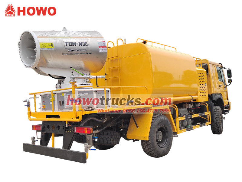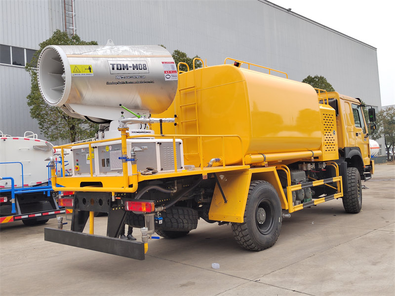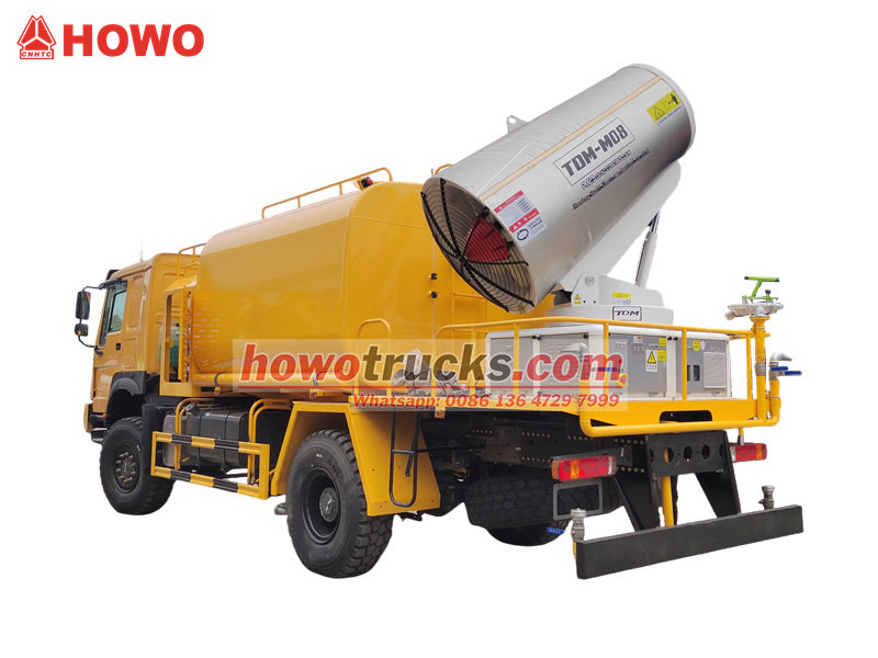 Lori la mizinga ya maji la HOWO 4×4 limejengwa kwenye chasisi ya HOWO yenye magurudumu yote, yenye injini ya 300HP na mfumo wa kuendesha wa 4×4, na kutoa utendaji bora katika maeneo tata. Likiwa na mizinga ya maji ya mita 80 yenye masafa marefu sana yenye pua 90, linaweza kunyunyizia ukungu laini wa maji (20-200μm) na eneo la juu la kufunika la 20,000㎡. Likichanganywa na tanki la maji lenye ujazo wa lita 10,000 na mfumo wa kunyunyizia wenye shinikizo kubwa, hufanya kazi kwa ufanisi kama vile kupunguza vumbi barabarani, kukandamiza vumbi la eneo la ujenzi, na kunyunyizia dawa za kilimo. Linafaa hasa kwa udhibiti wa vumbi katika maeneo ya migodi, bandari, ulinzi wa mazingira mijini, na nyanja zingine.