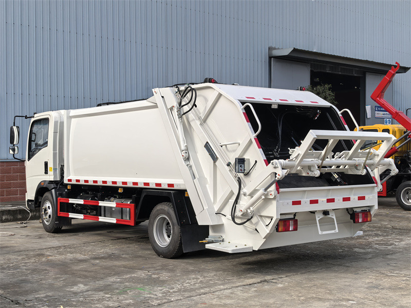 Lori la Howo 4x2 lenye mita za ujazo 8 la kidhibiti takataka hutumia chasi ya lori nyepesi ya Sinotruk Howo yenye msingi wa magurudumu wa 3800mm. Lina injini ya Cummins ISF3.8s3141 na sanduku la gia la WLY6TS55. Chombo cha juu cha takataka kina muundo wa arc, kimetengenezwa kwa chuma cha kaboni chenye pande zenye unene wa 4mm na sehemu ya chini yenye unene wa 5mm, na kimetibiwa kwa ajili ya kuzuia kutu na kutu. Lina pipa la taka lililowekwa nyuma na linaweza kuwekwa mapipa ya kawaida ya taka ya 110L na 240L. Mfumo wa udhibiti wa CAN-BUS huruhusu ukusanyaji, kubana, na kupakua taka kupitia kisanduku cha kudhibiti umeme kwenye teksi, vali ya kudhibiti majimaji upande wa dereva, kisanduku cha kudhibiti umeme upande wa kushoto wa lango la nyuma, na lever ya uendeshaji wa mkono upande wa kulia.