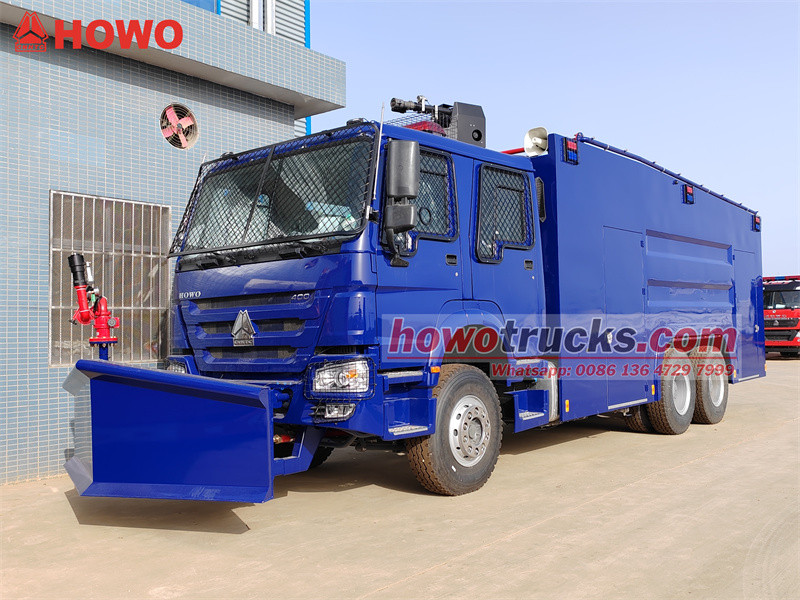 Lori la HOWO 6x4 linalostahimili mlipuko limerekebishwa kulingana na chasisi ya teksi ya HOWO HW76 yenye mistari miwili. Lina msingi wa gurudumu wa 4600+1350mm, lina injini ya WP12S400E201, na sanduku la gia la HW19710. Gari lina vifaa vya mwili wa sanduku linalostahimili mlipuko, bunduki kuu juu, na bunduki msaidizi ya maji ya mbele mbele, ambayo inaweza kufikia udhibiti wa ghasia wa pande zote, mtiririko mkubwa, na umbali mrefu. Lina teksi yenye mistari miwili na wafanyakazi wa watu 6. Tenki la maji lina ujazo wa lita 10,000, tenki la povu lina ujazo wa lita 100, tenki la rangi lina ujazo wa lita 100, na tenki la maji la pilipili lina ujazo wa lita 100. Lina vifaa vya pampu ya moto ya CB10/60. Sehemu ya mbele ya gari ina vifaa vya chuma vya kuzuia ghasia na koleo la chuma lenye nguvu la kuondoa vizuizi vya majimaji.
