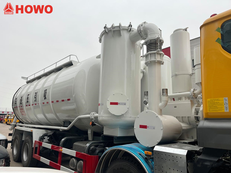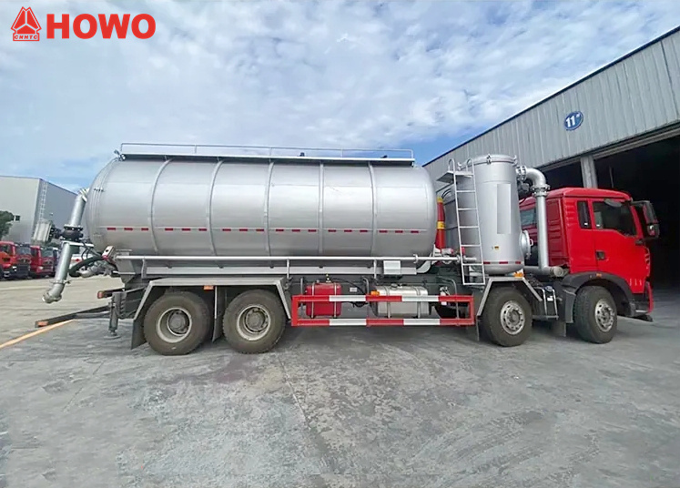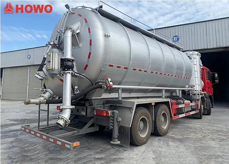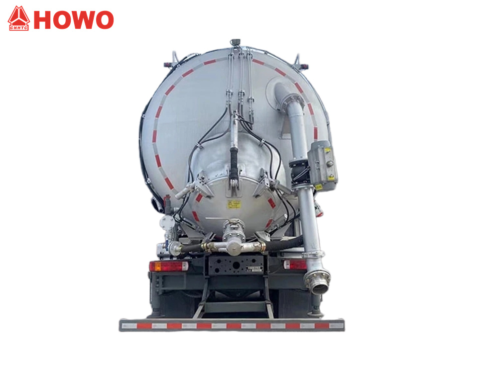 Gari la kufyonza na kusafirisha shinikizo la HOWO 8x4 25 cbm, lililorekebishwa kwenye chasisi ya HOWO TX350 8x4, lenye msingi mkubwa wa gurudumu la 1800+4600+1350mm, lenye injini ya Sinotruk MC07H.35-60 na sanduku la gia la HW15710L. Sehemu ya juu ya mwili ina vichujio vya mifuko, na sehemu ya nyuma ina tanki la kuhifadhia. Lina vifaa vya kutolea nje vya majimaji, feni, mabomba ya kuingiza hewa kutoka nje, pampu za utupu, vigandamiza hewa, mitungi ya kuinua, mifumo ya kuchuja, mifumo ya mabomba ya kufyonza na kutoa, masanduku ya kudhibiti kielektroniki, n.k. Pampu ya utupu ina uvutaji hasi wa shinikizo na kigandamiza hewa kina utokaji chanya wa shinikizo.